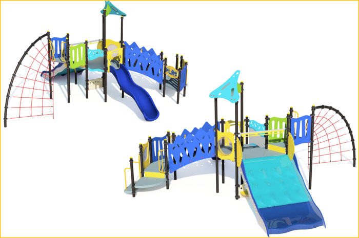大小異なるすべり台やネット遊具、点字パネル、ベンチなどの様々な遊びの機能がある複合遊具だそうですよ!