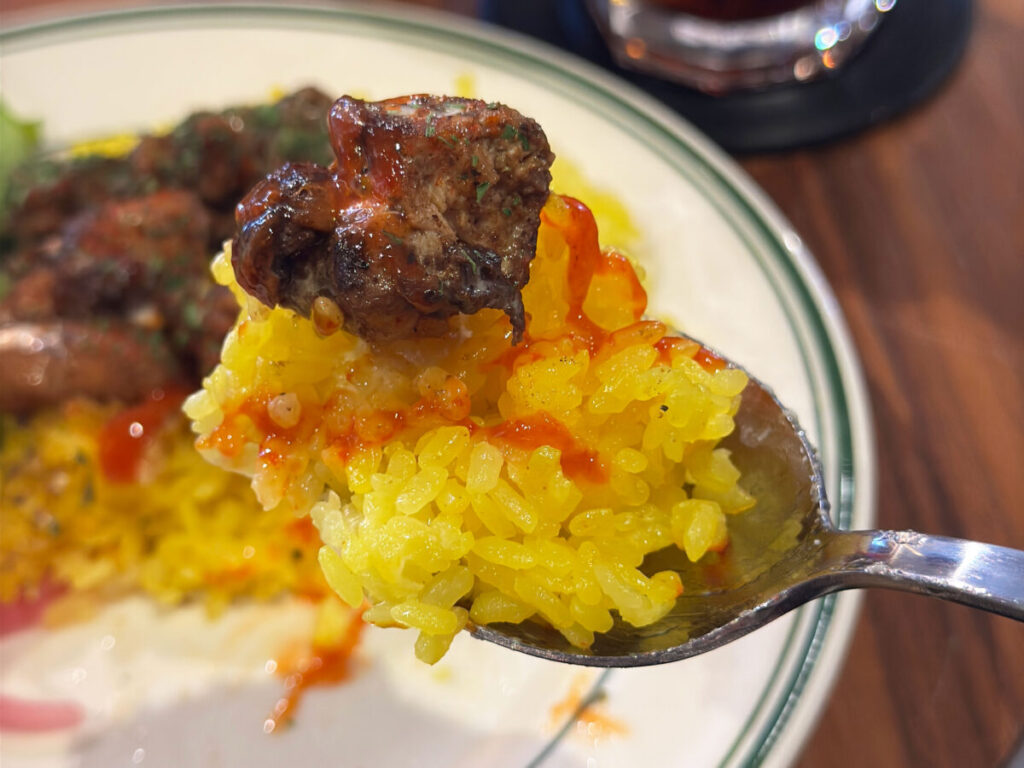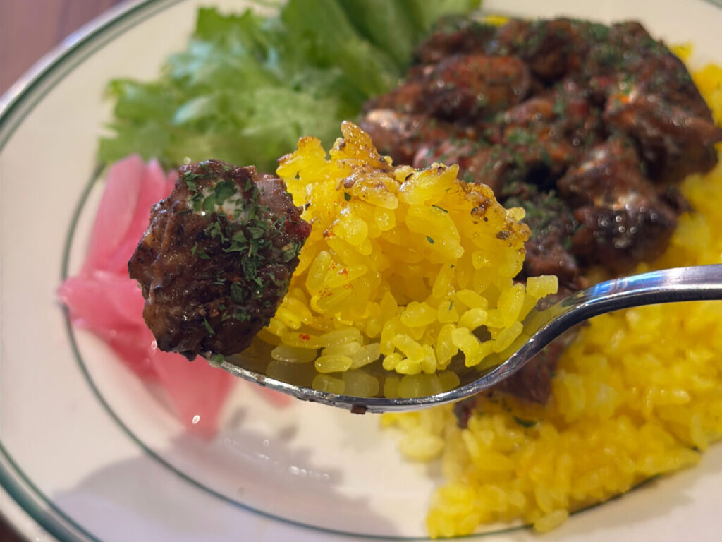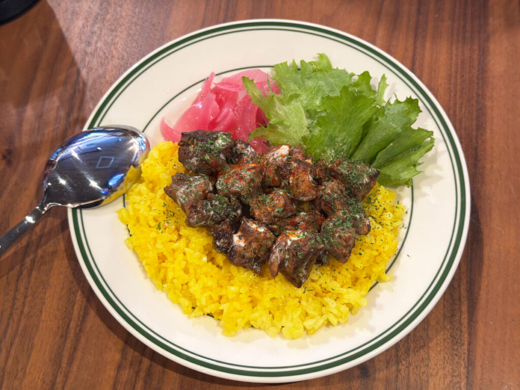 店員さんによると「チキンオーバーライス」は、もともとトルコ料理発祥。Kmiyer’s coffeeのものは、ニューヨークで人気のジャークチキンを使ったカリビアン系オーバーライスなんだそうですよ!