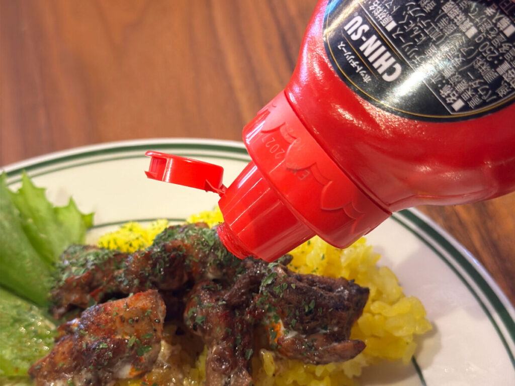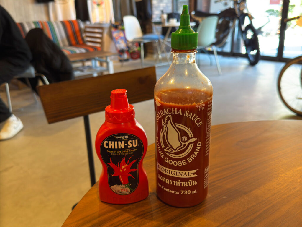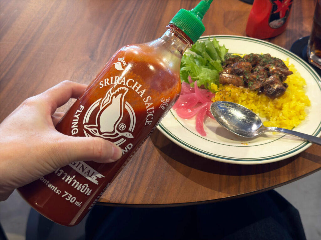 よ〜っし、ここらでシラチャーソースをかけて味変してみよっと。