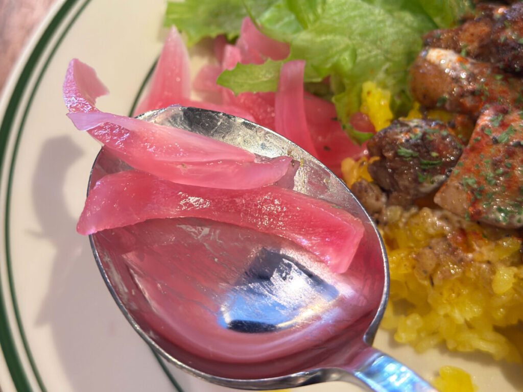 付け合わせを食べてみよっと。玉ねぎかな?