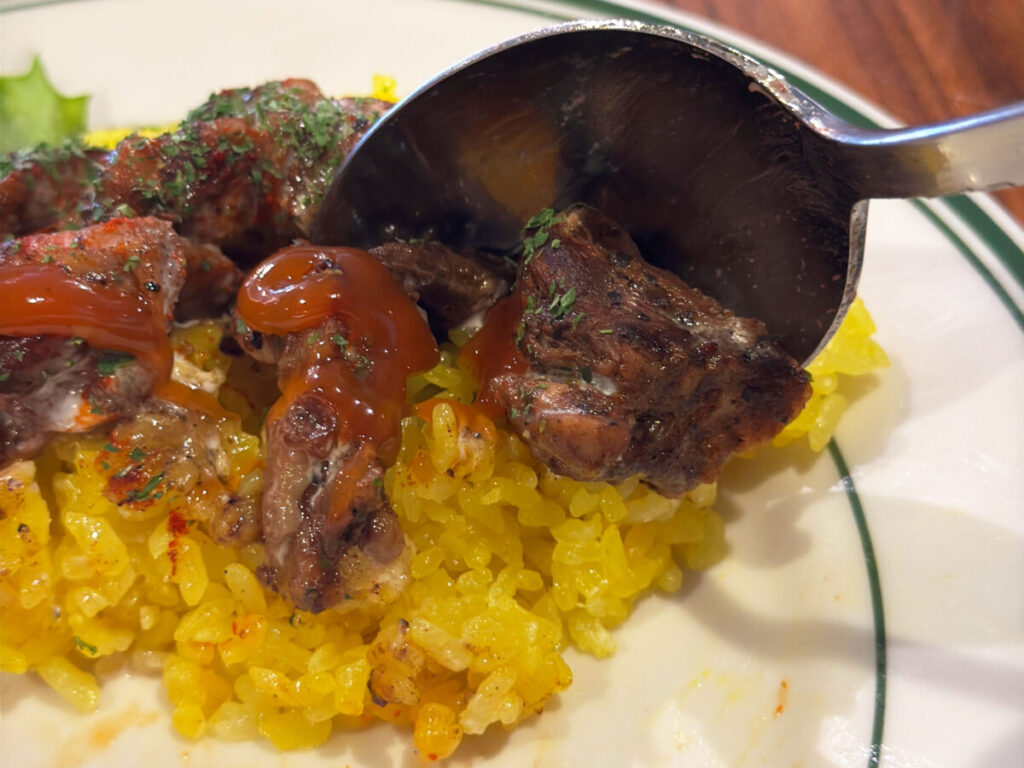 黄色いターメリックライスの上には、ゴロゴロたっぷりのチキン。
