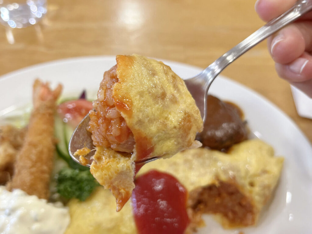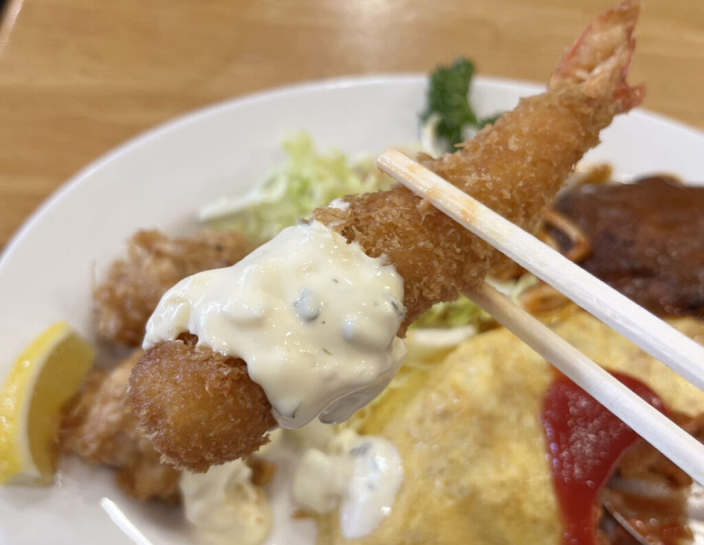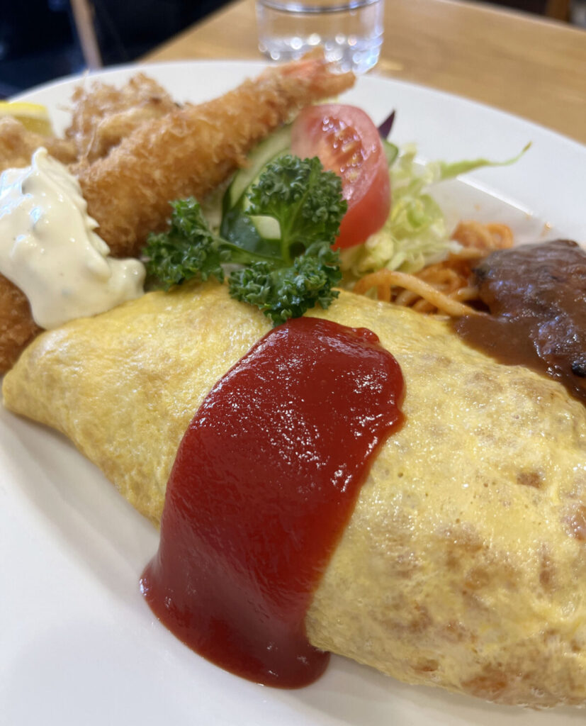 オムライスにエビフライにから揚げに、ハンバーグとその下にはナポリタンまで?!