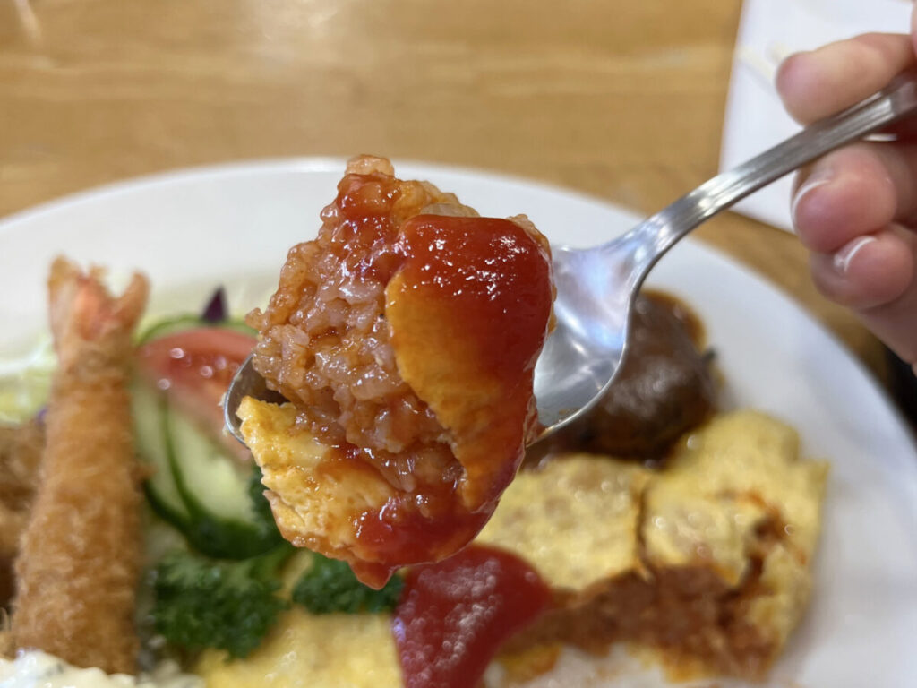 そして極め付きは、ハンバーグとオムライスを同時に”わんぱく食い”だ~!