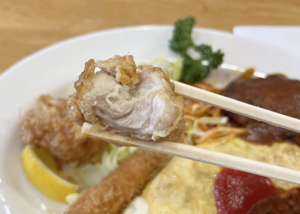 お次はから揚げ!タルタルソースをまとわせてぱくりっ。
