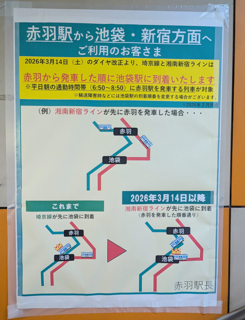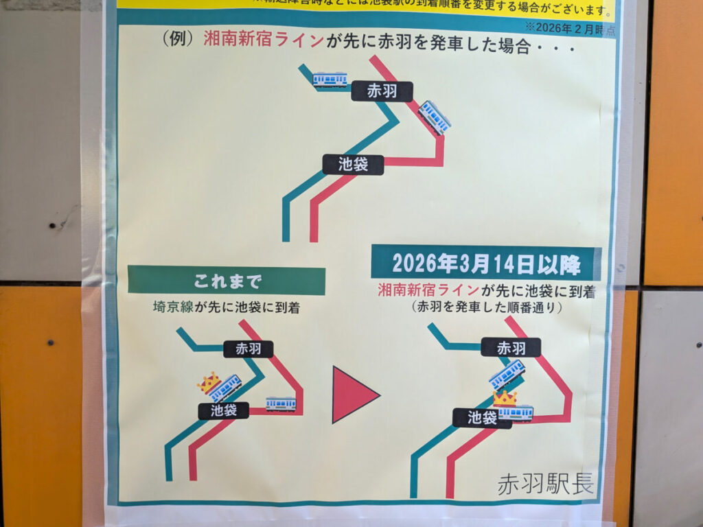 内容は「赤羽から発車した順に池袋駅に到着します」というもの。