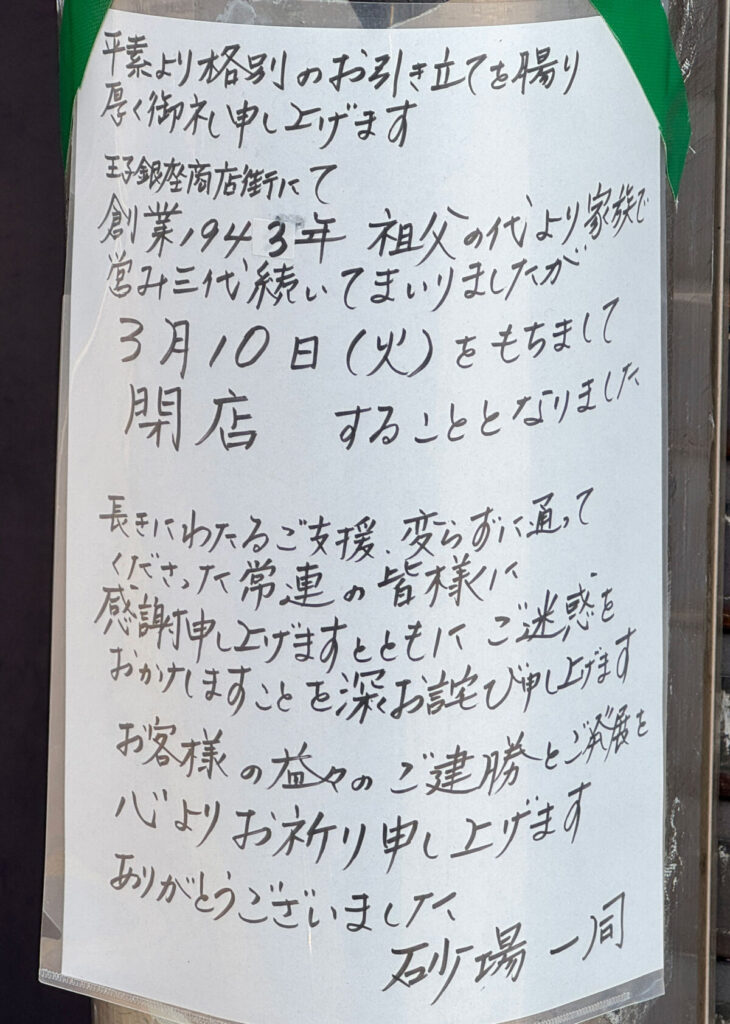 王子のそば屋「砂場」が、3月10日(火)をもって閉店へ
