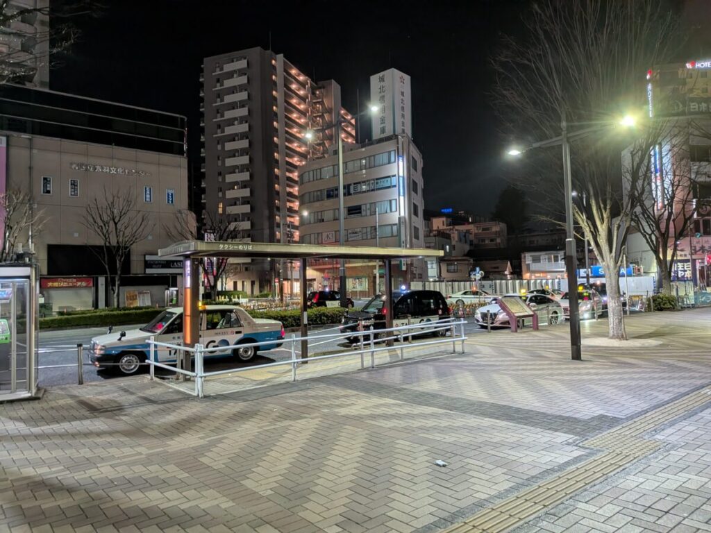 西口ロータリーには、たくさんのタクシーが停まってる。