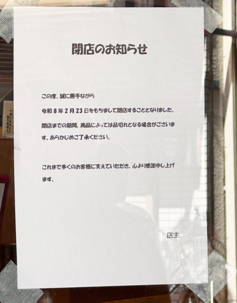 2月23日(月・祝)に現地へ行ってみると、店頭に「令和8年2月23日をもちまして閉店することとなりました」というお知らせが出ていましたよ。