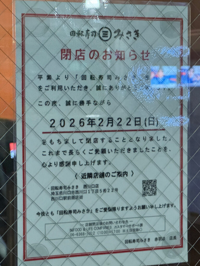 赤羽駅前にある「回転寿司みさき」が、2月22日(日)をもって閉店したみたい。店頭にお知らせが出ていましたよ。