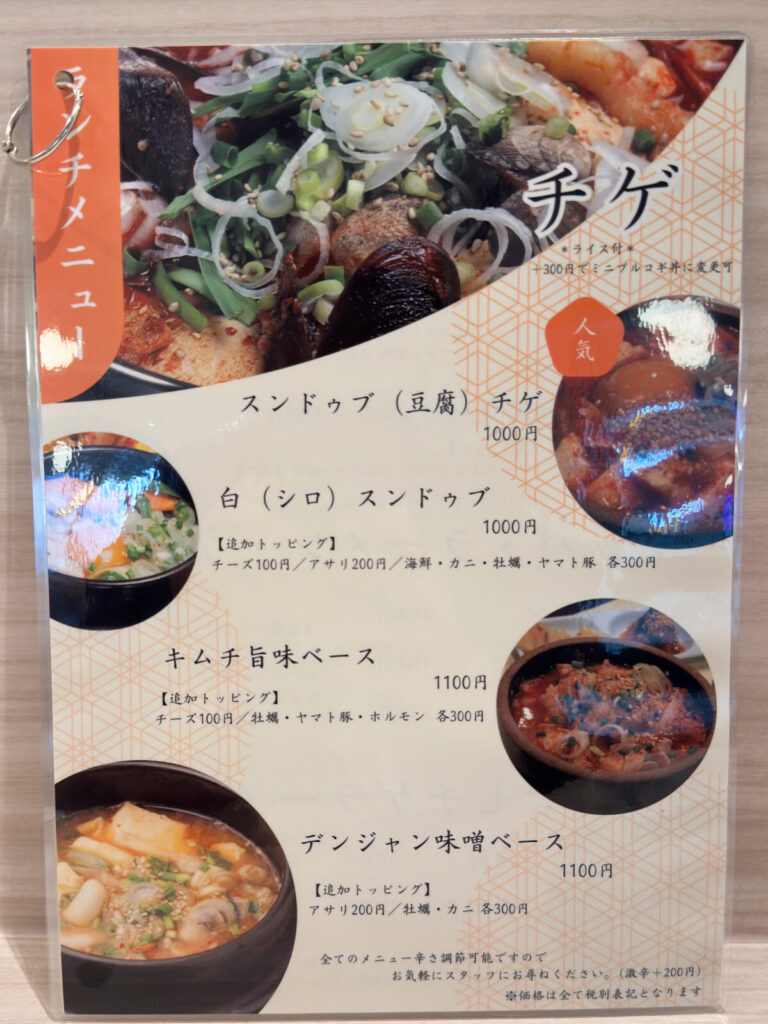 そして、通しメニューはこちら。一品料理やチヂミなどもランチタイムから頼めるとのこと!