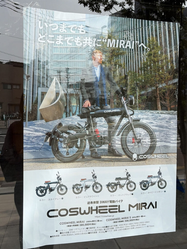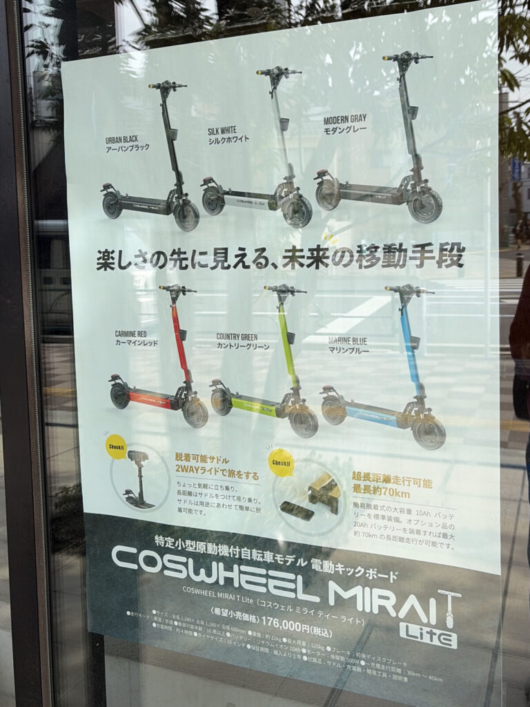 十条駅前のジェイトモール1階に、電動バイク&キックボード「COSWHEEL MIRAI」なる貼り紙が貼ってありました。