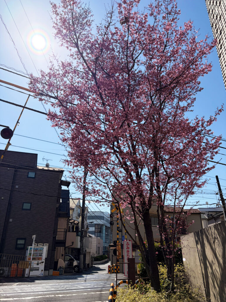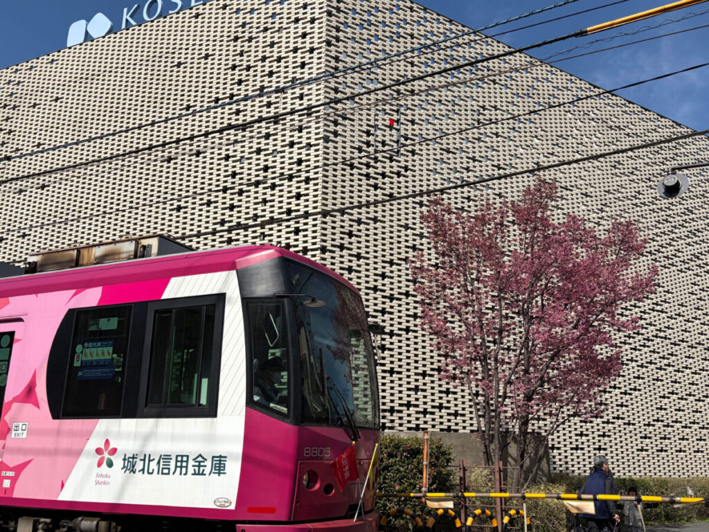 コーセー 先端技術研究所と都電の踏切前の桜,満開に近づいてる!