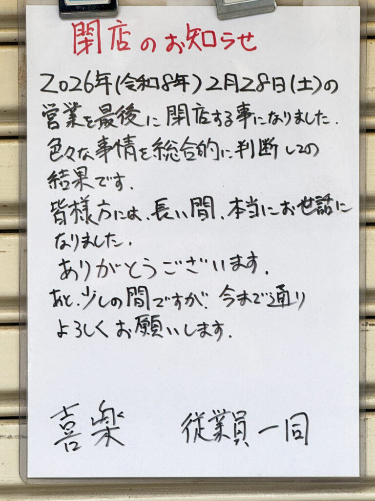 お店のシャッターに「2026年(令和8年)2月28日(土)の営業を最後に閉店する事になりました。」という閉店のお知らせが出ていました。