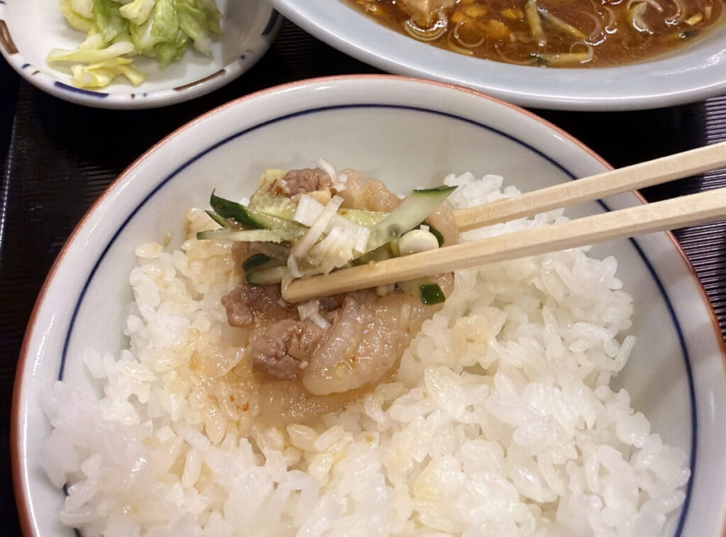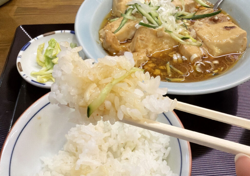 お肉はキュウリとともにご飯にワンバンさせ、ぱくっと!