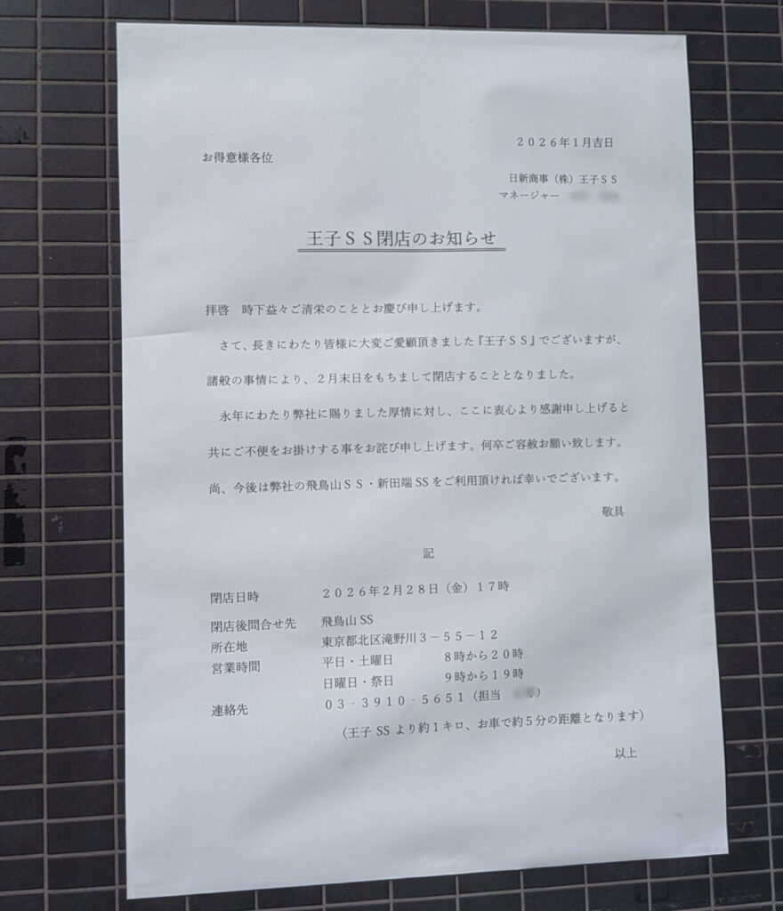 王子駅北東の明治通り沿いにあった「ENEOS 王子SS」が、2月28日をもって閉店したみたい。