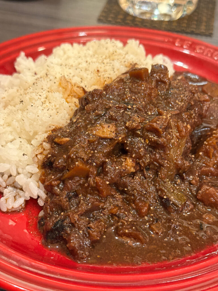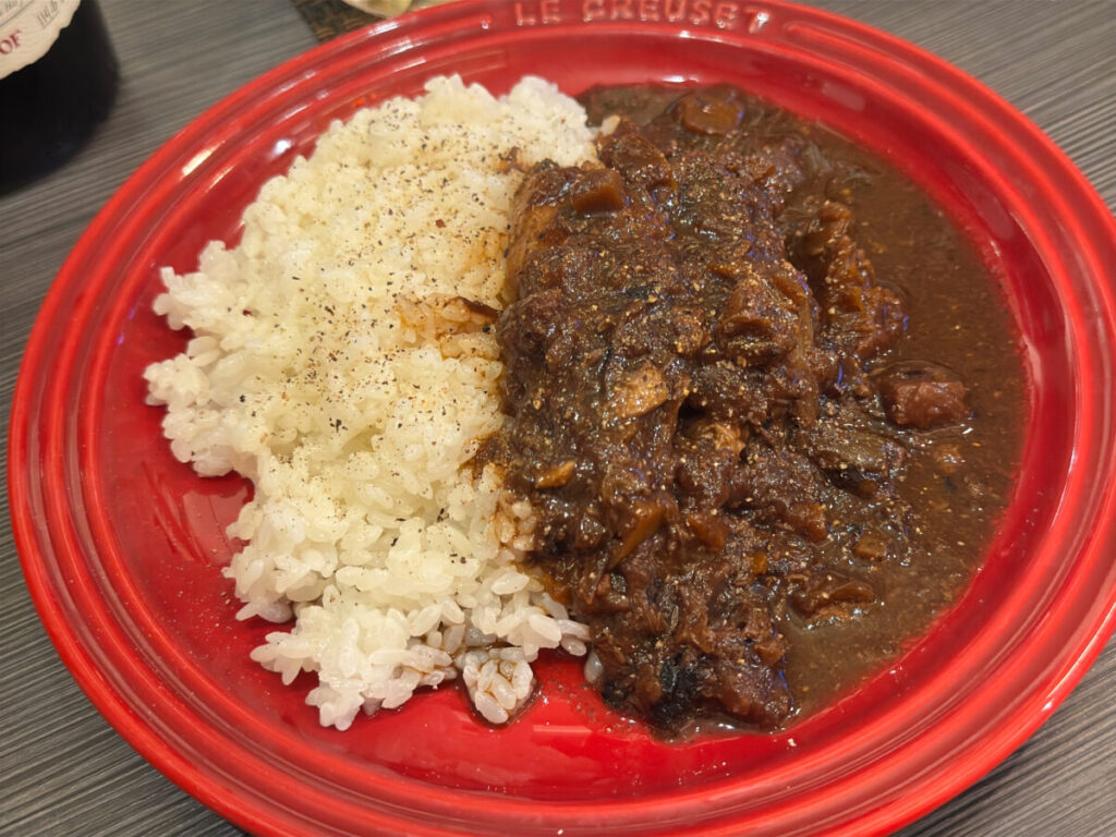 仕上げにブラックペッパーを振った1皿は、深い茶色のルーが特徴的。見ただけで煮込まれて佇まい!