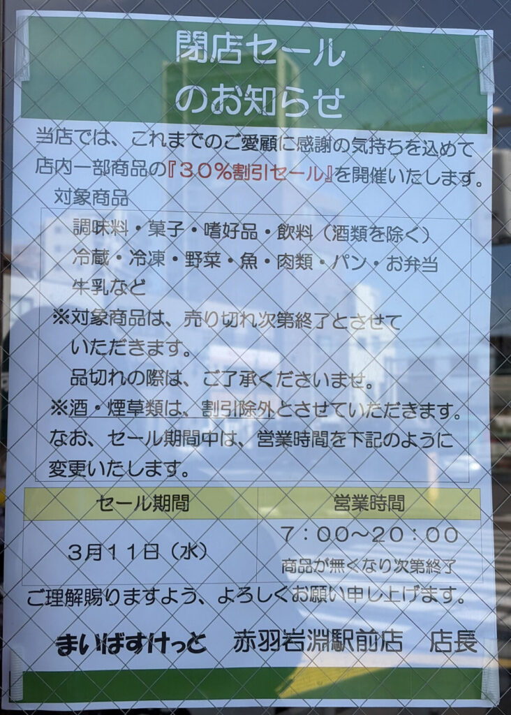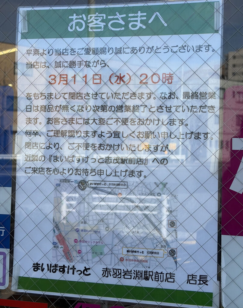 赤羽岩淵駅前にある「まいばすけっと」が、3月11日をもって閉店するみたい。