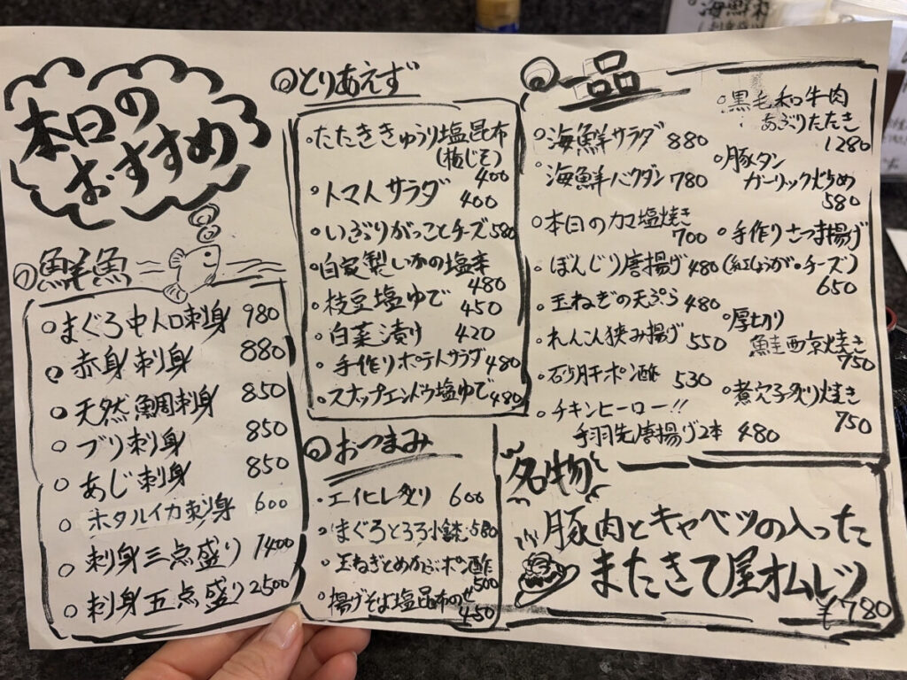 十条駅前のバス通りから1本入った路地に、魚と蕎麦のおいしい居酒屋「またきて屋」が2月22日に新オープンしたみたい!