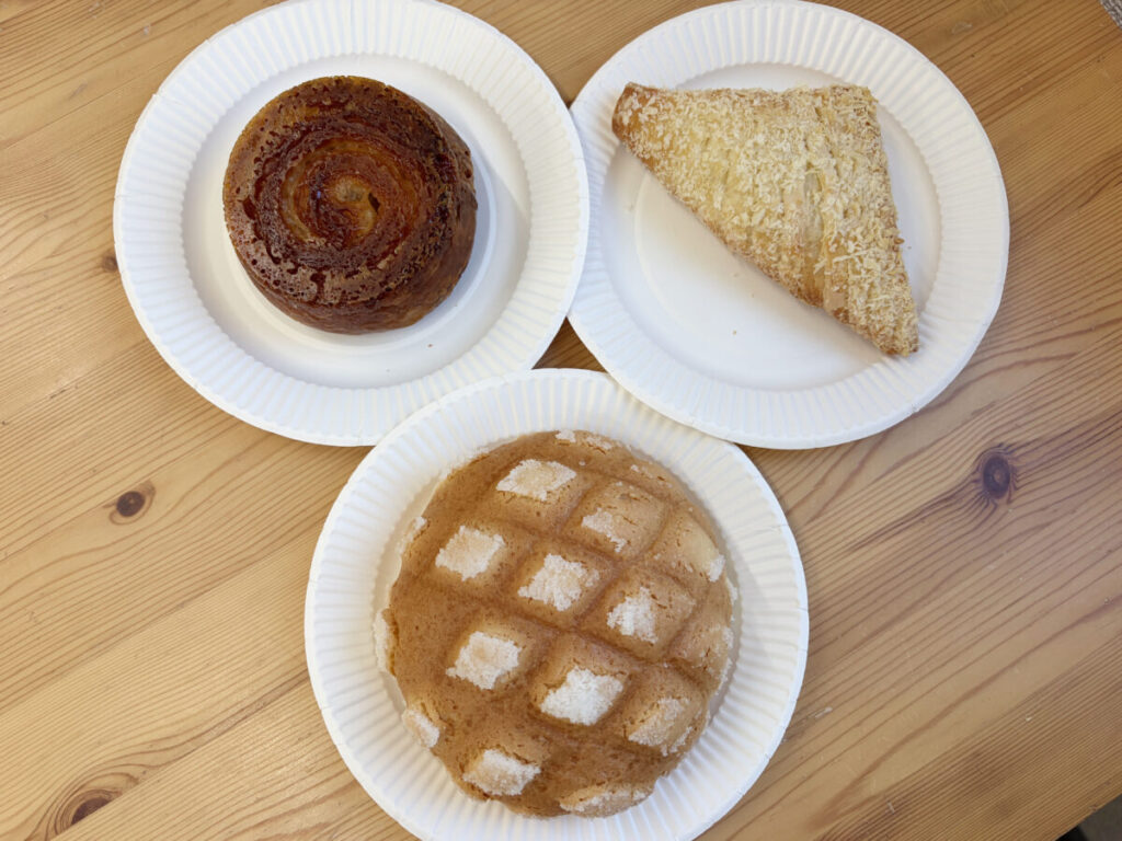 左上:発酵バターのクイニーアマン(320円)、右上:ハムチーズデニッシュ(250円)、下:あのメロンパン(280円)です。