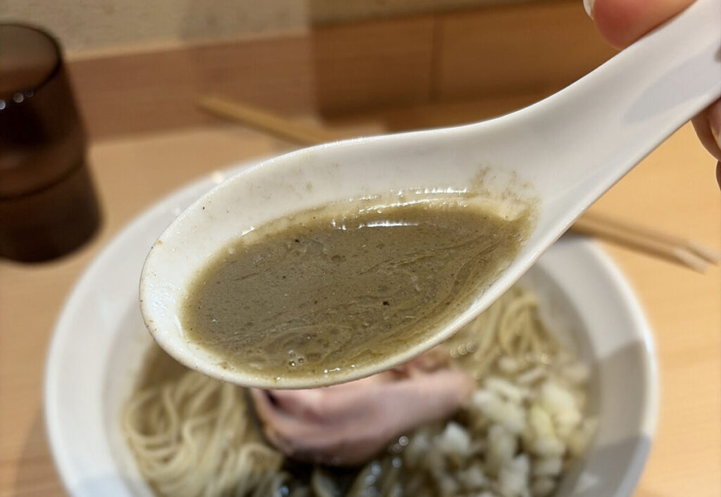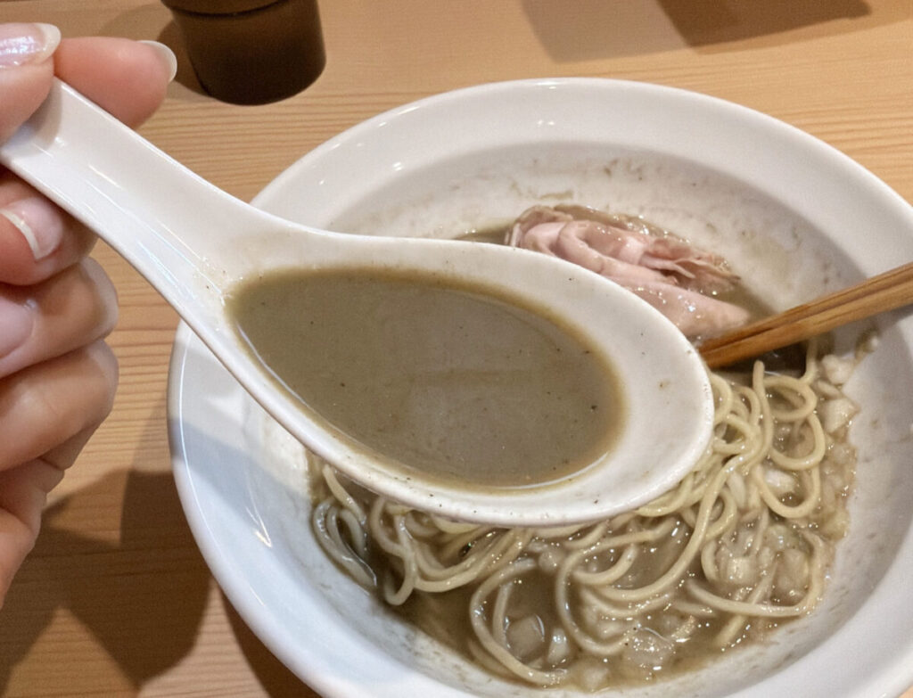麺をもぐもぐしている合間に、無意識にスープを飲もうとする私の左手。