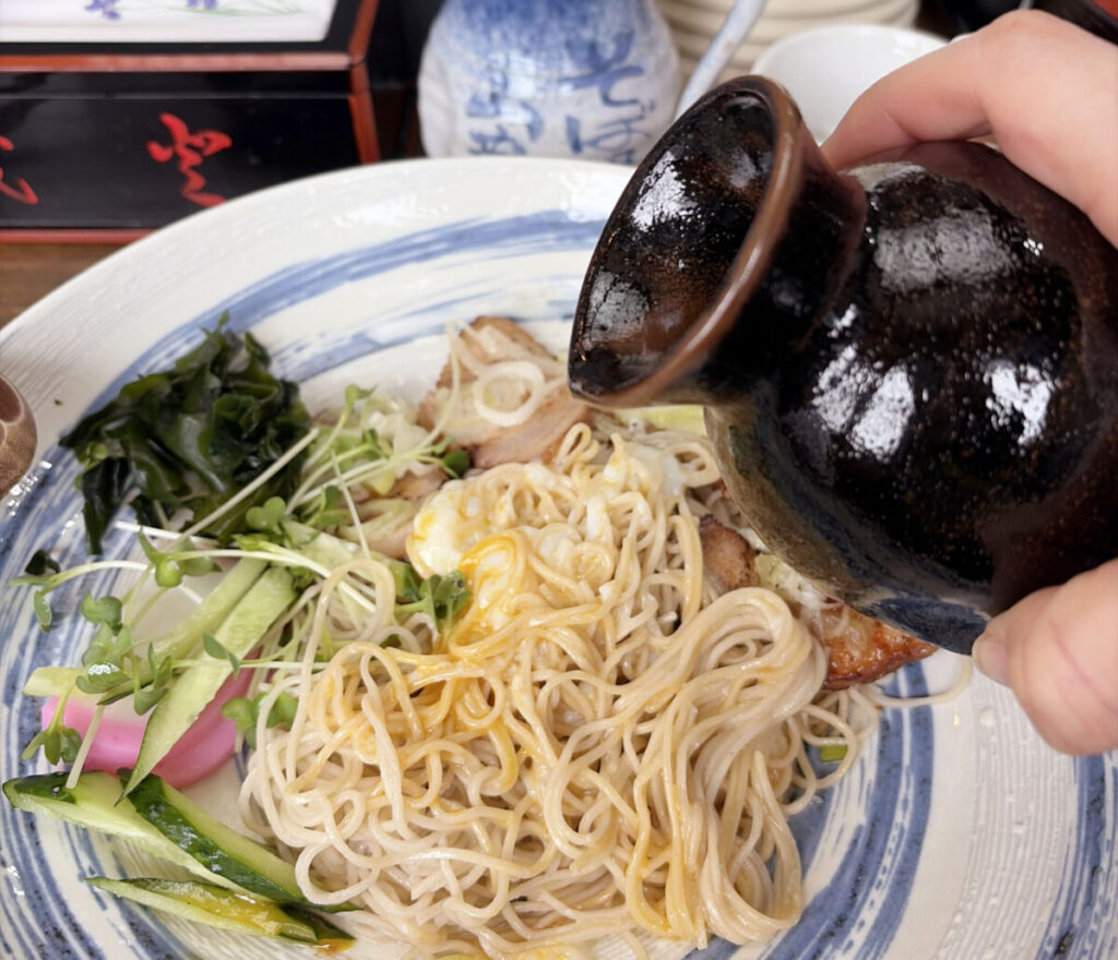 お蕎麦には自家製チャーシューのタレがかかっているのでまずはそのまま、その後おつゆをかけて食べてみてくださいね、とのこと。