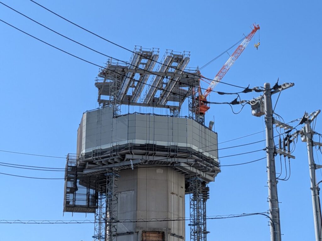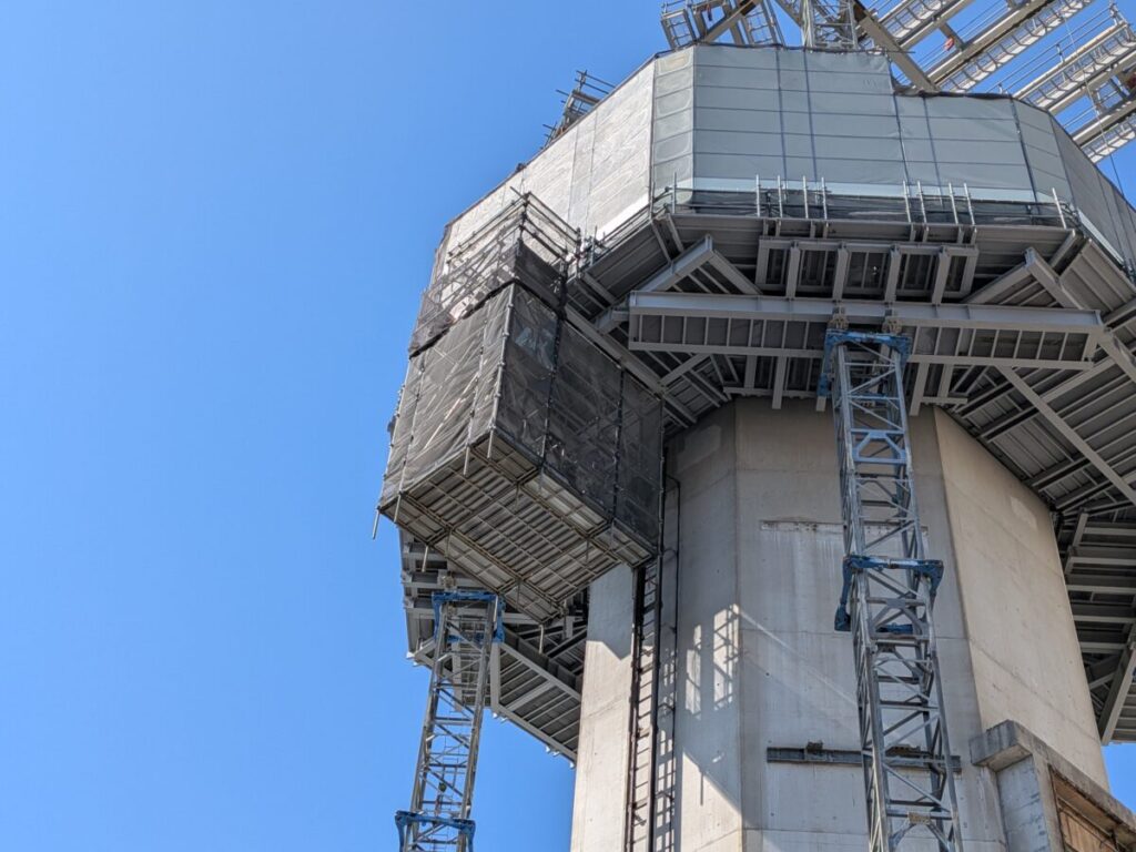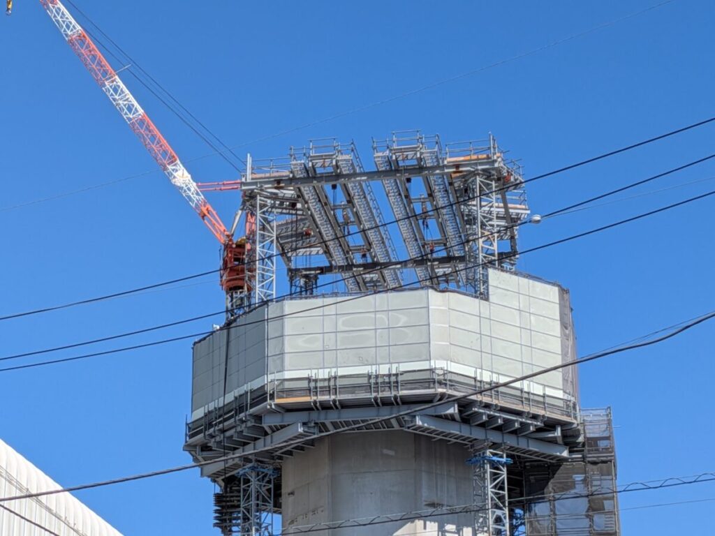煙突の上部には大きな作業設備が組まれていて、上からまさに解体を進めているような状態かと。