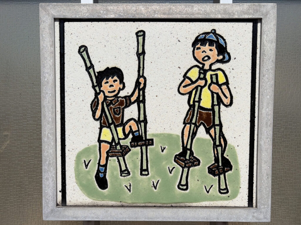 子供が竹馬で遊んでますね。