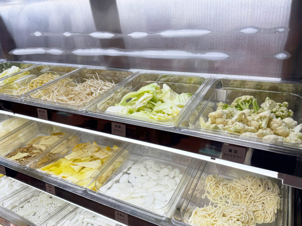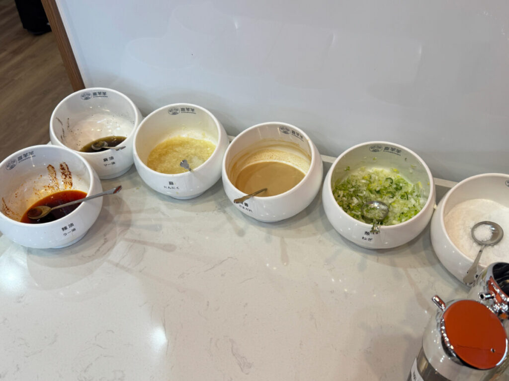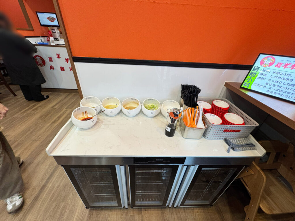 店内中央には、調味料やネギを入れられるセルフコーナーもありましたよ。