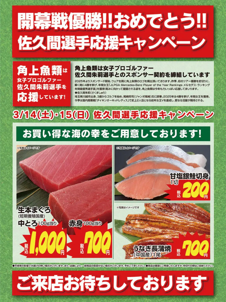 赤羽店含む角上魚類全店舗で、「女子プロゴルファー佐久間朱莉選手 優勝おめでとうセール」を3月14日(土)・15日(日)に緊急開催するみたい!