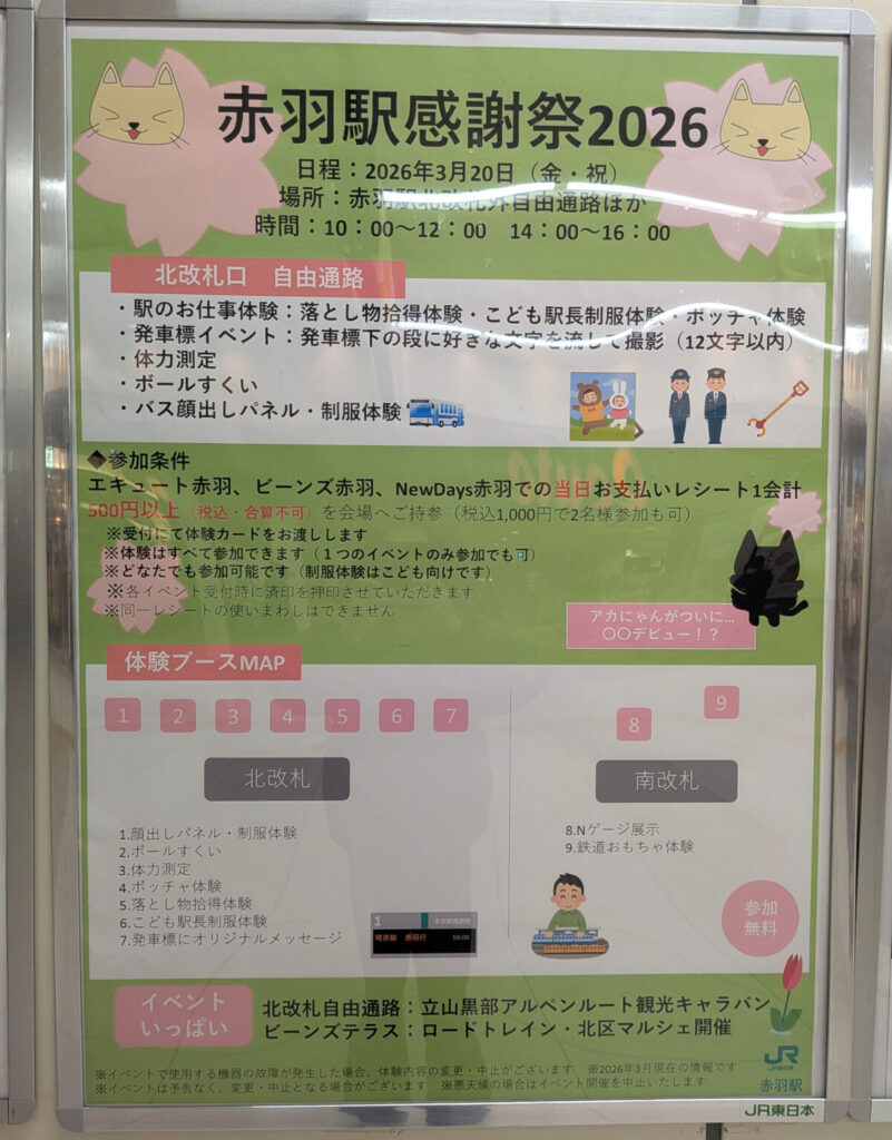 JR赤羽駅で「赤羽駅感謝祭2026」が3月20日(金・祝)に開催されるみたい。