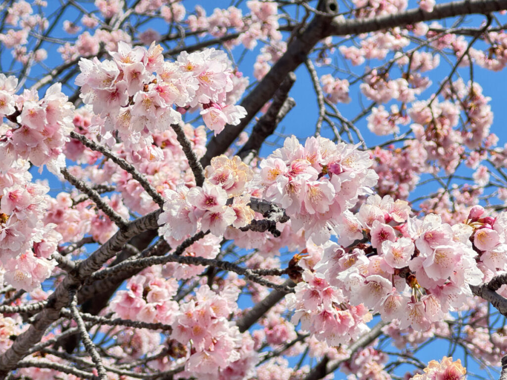 早咲きの安行桜は、川口市安行発祥の品種。濃いめのピンクが華やかで青空にめっちゃ映えるんです。