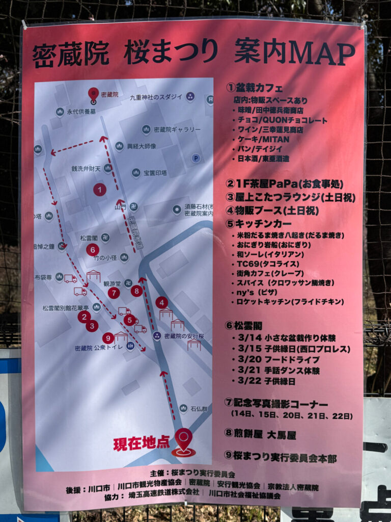 おっ「密蔵院 桜まつり」の案内MAPを発見。ほほ〜。色んなイベントが開催されているんだなあ。