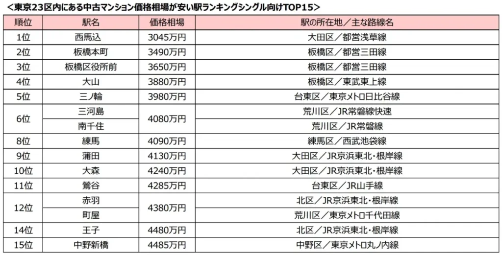 ランキングは、23区内の駅から徒歩15分圏内にある、シングル向け(専有面積20平米以上~50平米未満)中古マンション平均価格をもとに作られたものみたい。