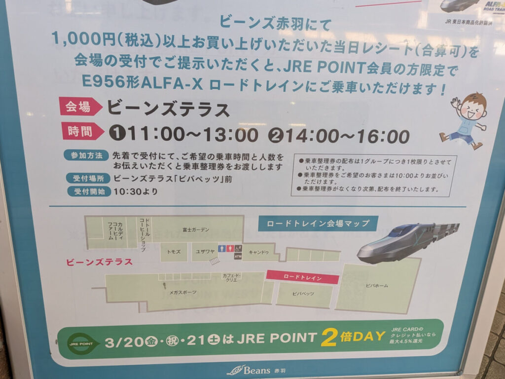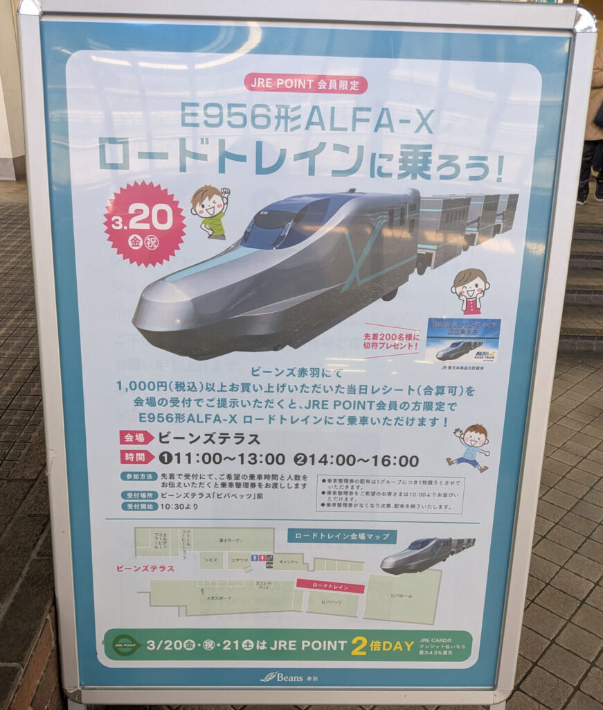 ビーンズ赤羽で3月20日(金・祝)に、新幹線「E956形 ALFA-X」のロードトレインに乗れるイベントがあるみたい!