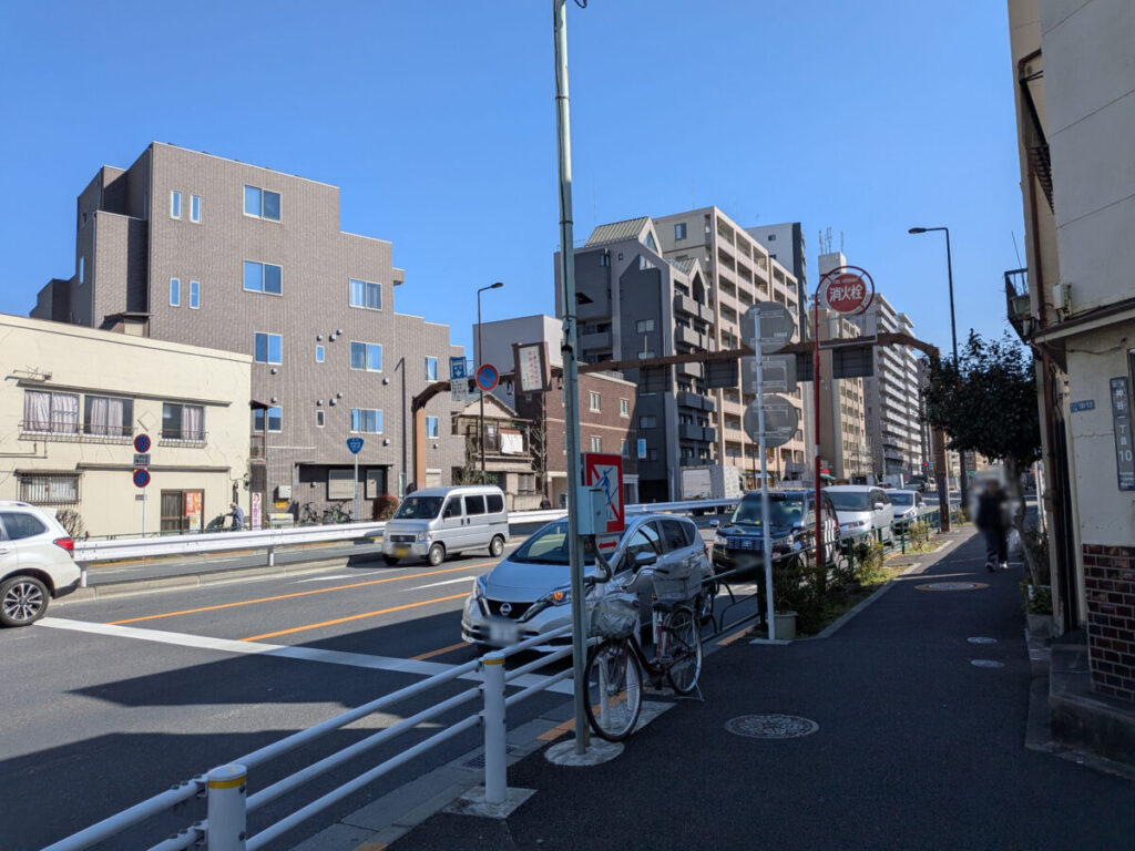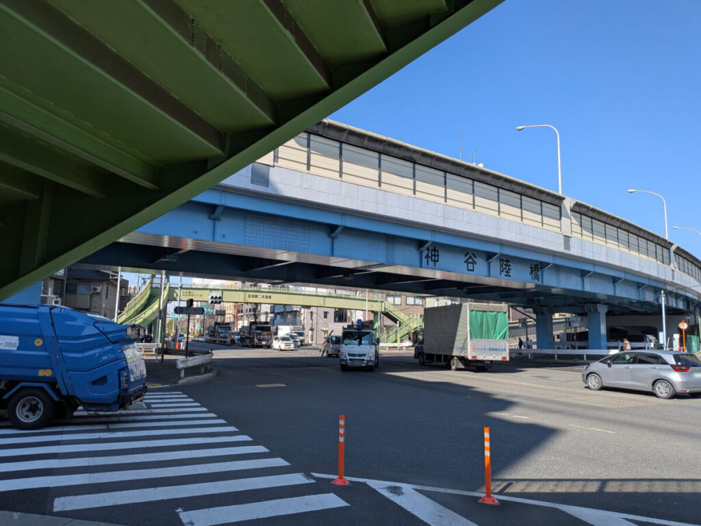 左です。目の前には、環七と北本通りが交差する「宮堀」交差点や「神谷陸橋」。