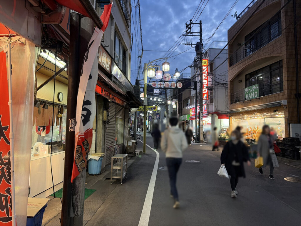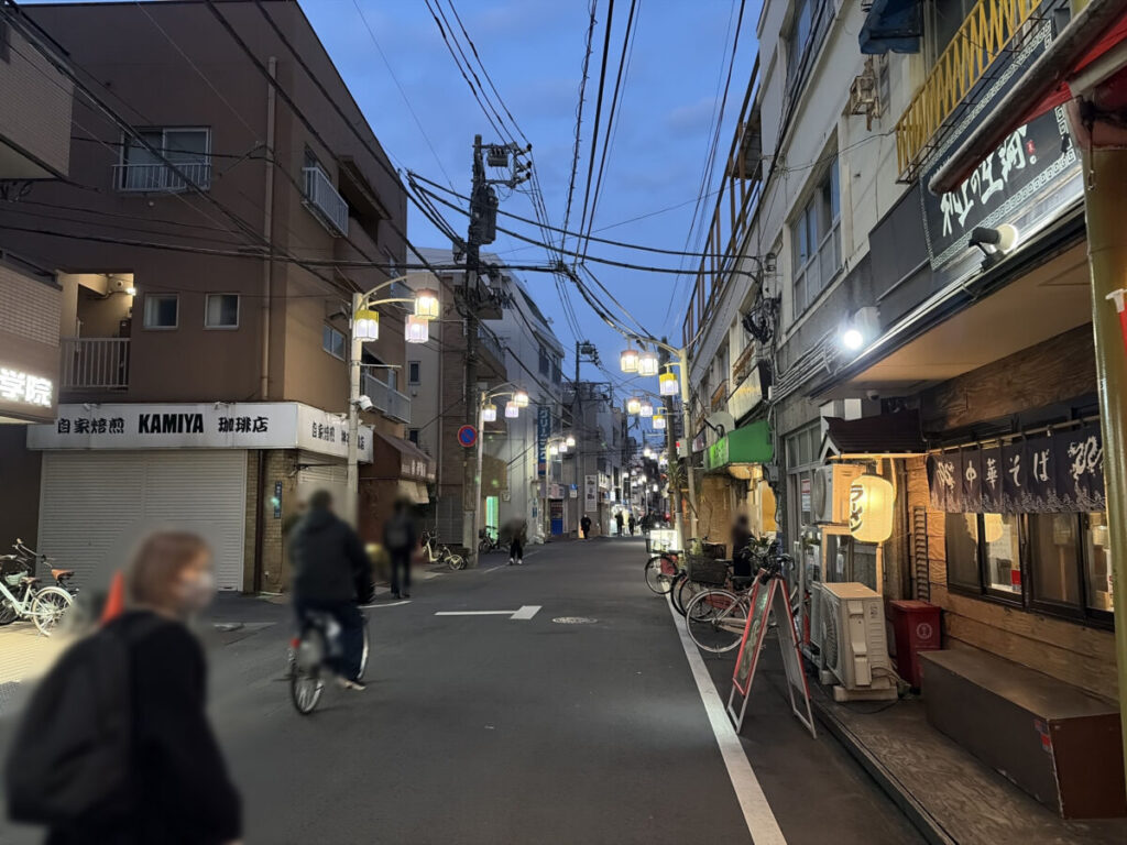 お店を背にして右はこんな感じ。隣は「我的中華そば 机上の空論」があり、さらに行くと「コモディイイダ 東十条店」があります。