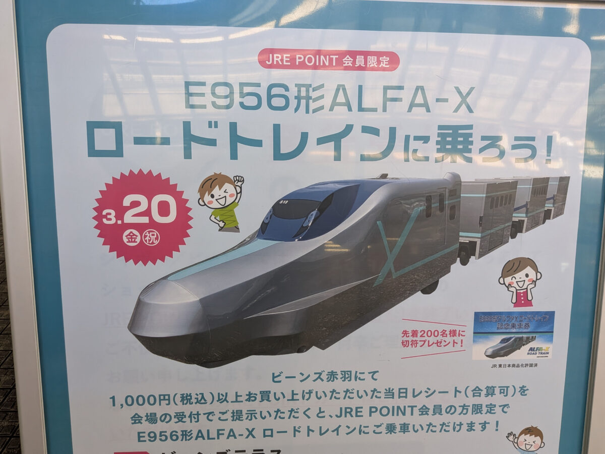 ビーンズ赤羽に新幹線「E956形 ALFA-X」ロードトレインに乗れるイベントがあるみたい!ビーンズ赤羽で3月20日(金・祝)に、新幹線「E956形 ALFA-X」のロードトレインに乗れるイベントがあるみ...