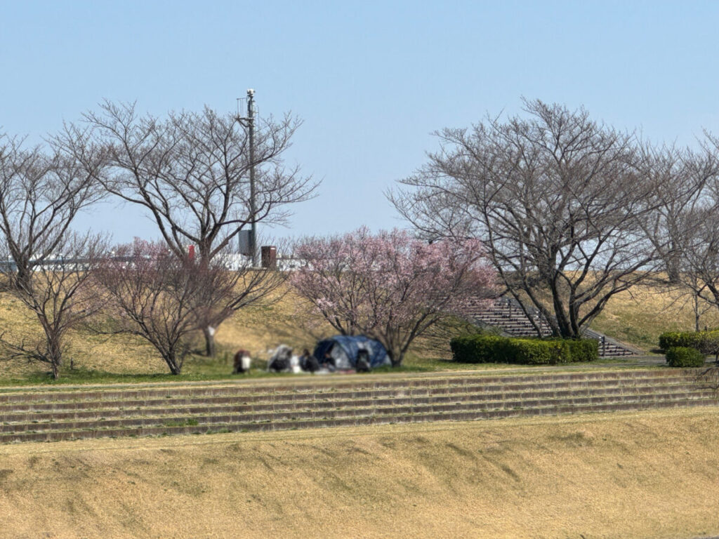 おっ!ピンクに染まった木の下でお花見している人がいる〜!