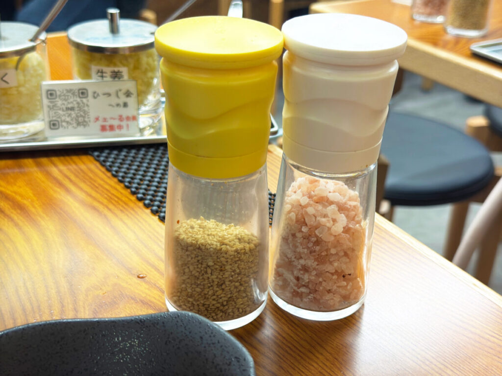 焼き上がりを待つ間に卓上チェック。にんにく・生姜・一味・ごま・ピンクソルトがずらり。