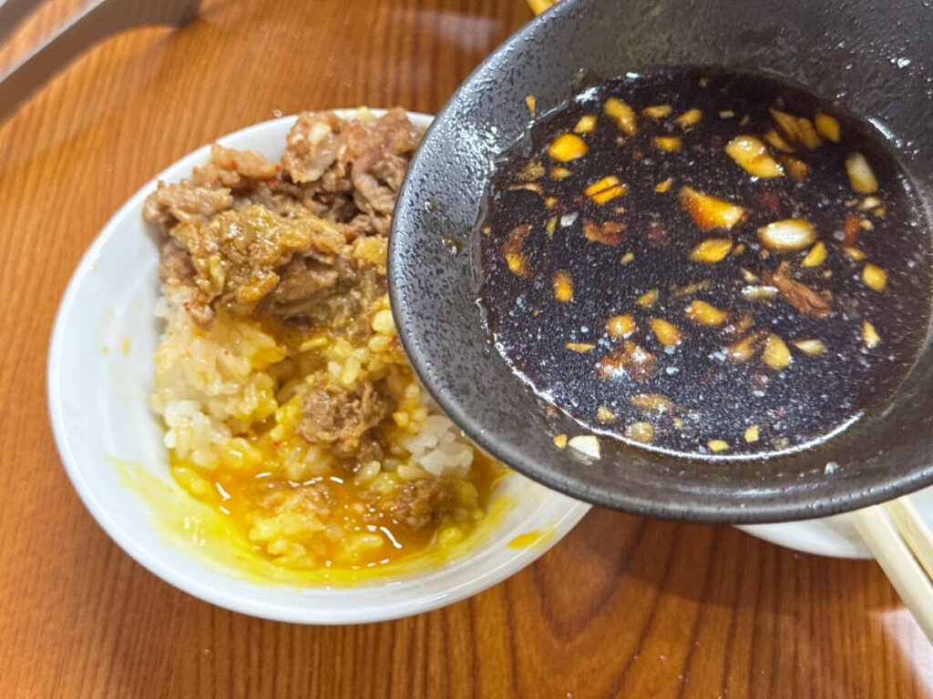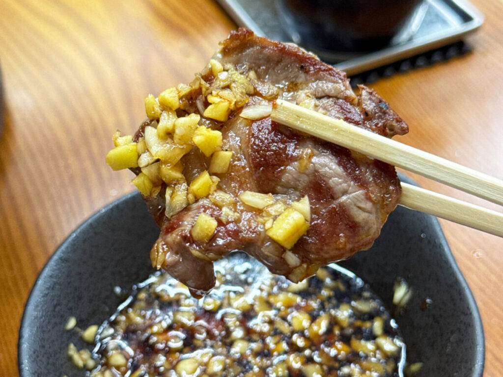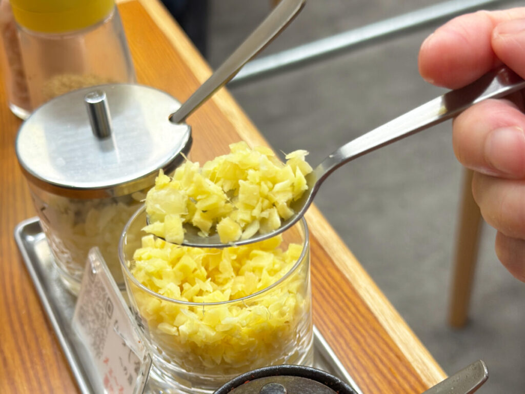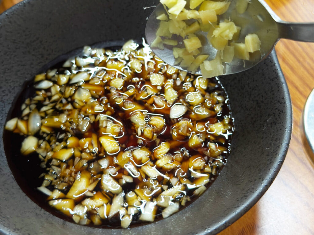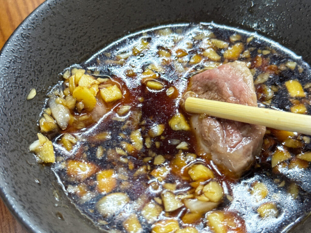 店員さんが、にんにくと生姜を入れるのがおすすめ!とのことで、タレにイン!