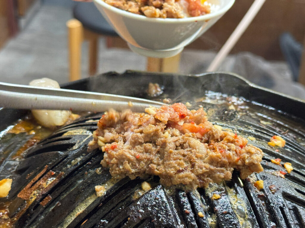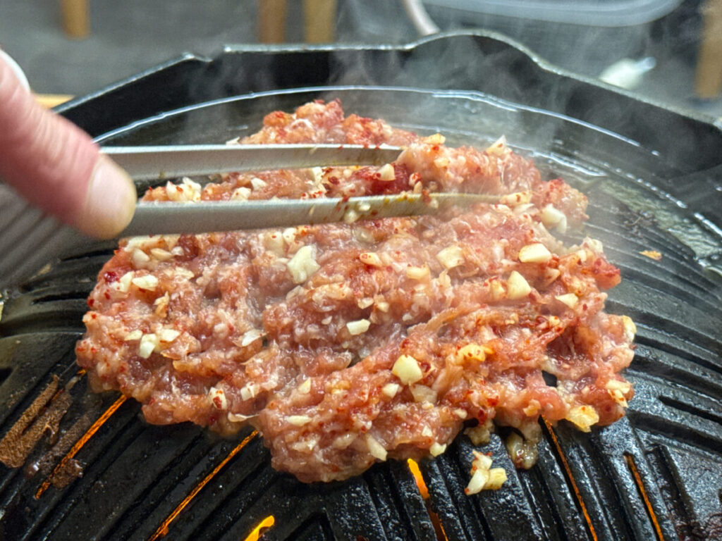 ジュージュー音を立てながら、押し焼きされていくミンチ…たまらん…。