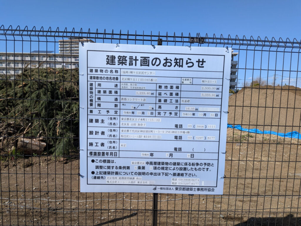 桐ヶ丘に「(仮称)桐ヶ丘区民センター」の建築計画が掲示されてました。