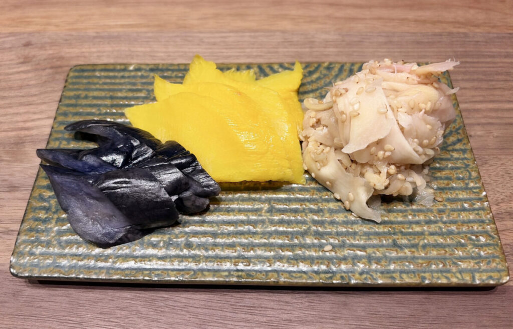 天ぷらとともに、箸休めの漬物盛り合わせも登場。