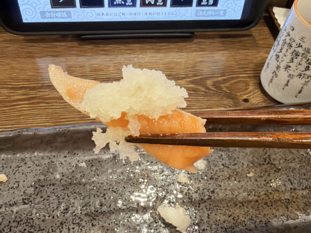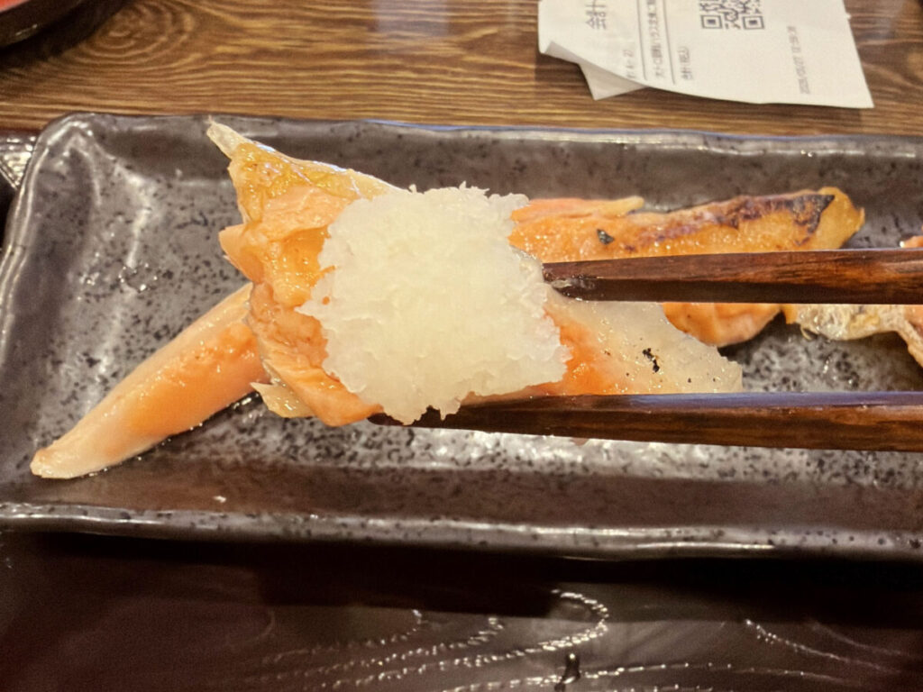 より脂がのっていそうな部分、大根おろしをたっぷり乗っけてぱくりっ。