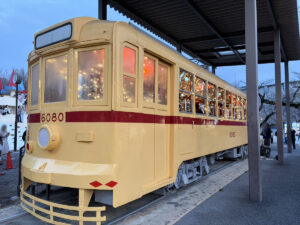 飛鳥山で始まった、ドラマ「キンパとおにぎり」とコラボした都電のライトアップ。 こちらがライトアップされた都電の様子↓ 18時前に点灯され、現地では多くの人が足を止...