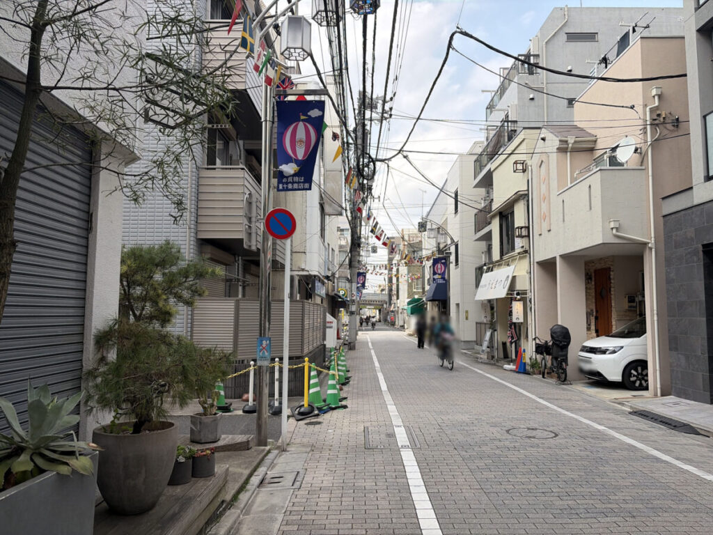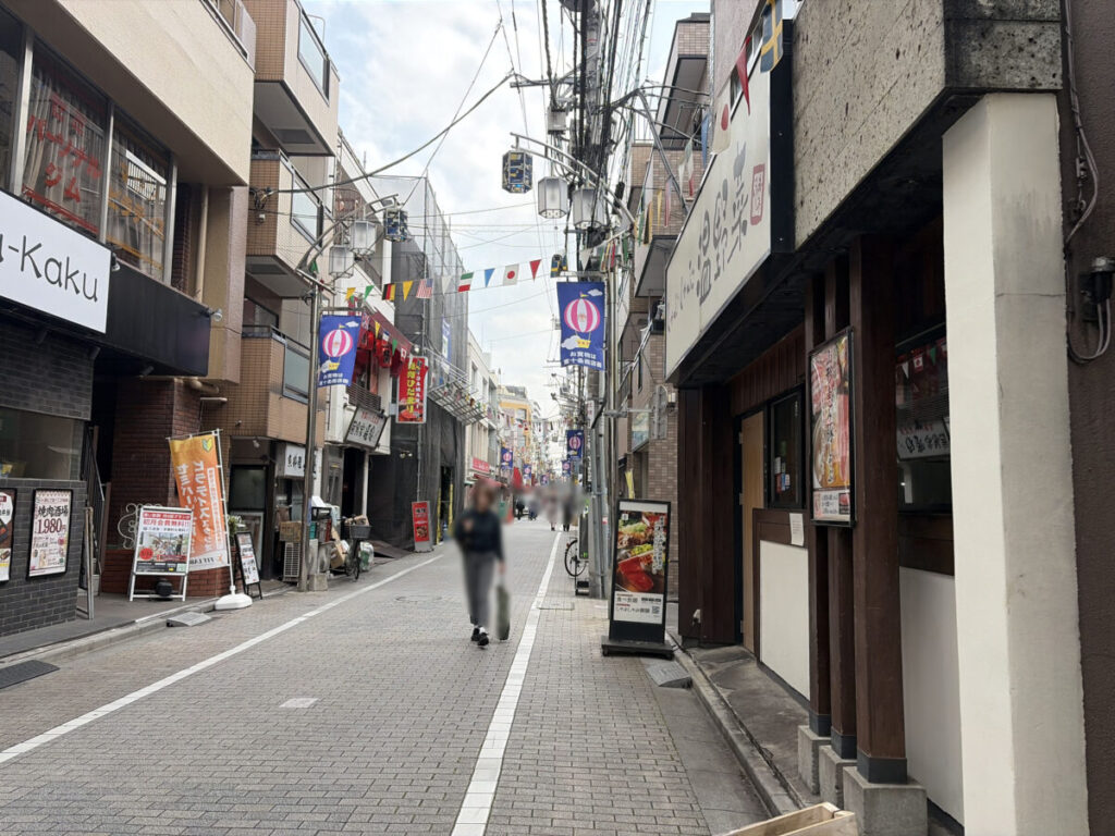 お店を背にして右はこんな感じ。隣は「しゃぶしゃぶ温野菜」で、さらに行くと「スーパーみらべる東十条店」があります。