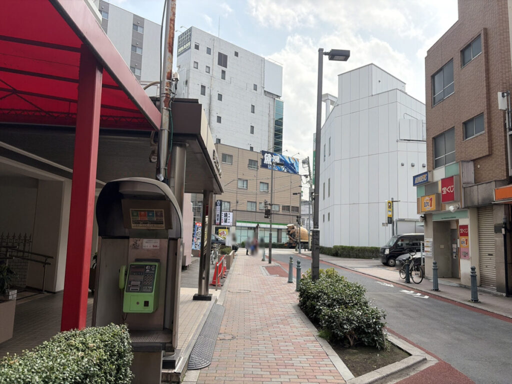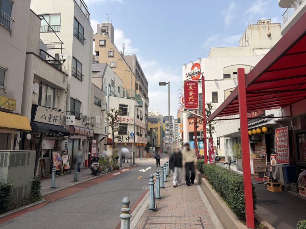 お店を背にして右はこんな感じ。斜向かいにラーメン「八重桜」があり、さらに行くと「串カツ田中」があります。