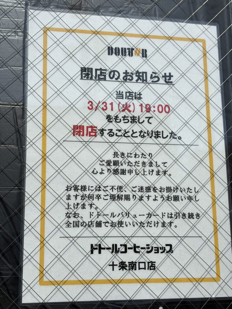 十条駅南口を出てすぐのところにあった「ドトールコーヒーショップ」が、3月31日をもって閉店したみたい。