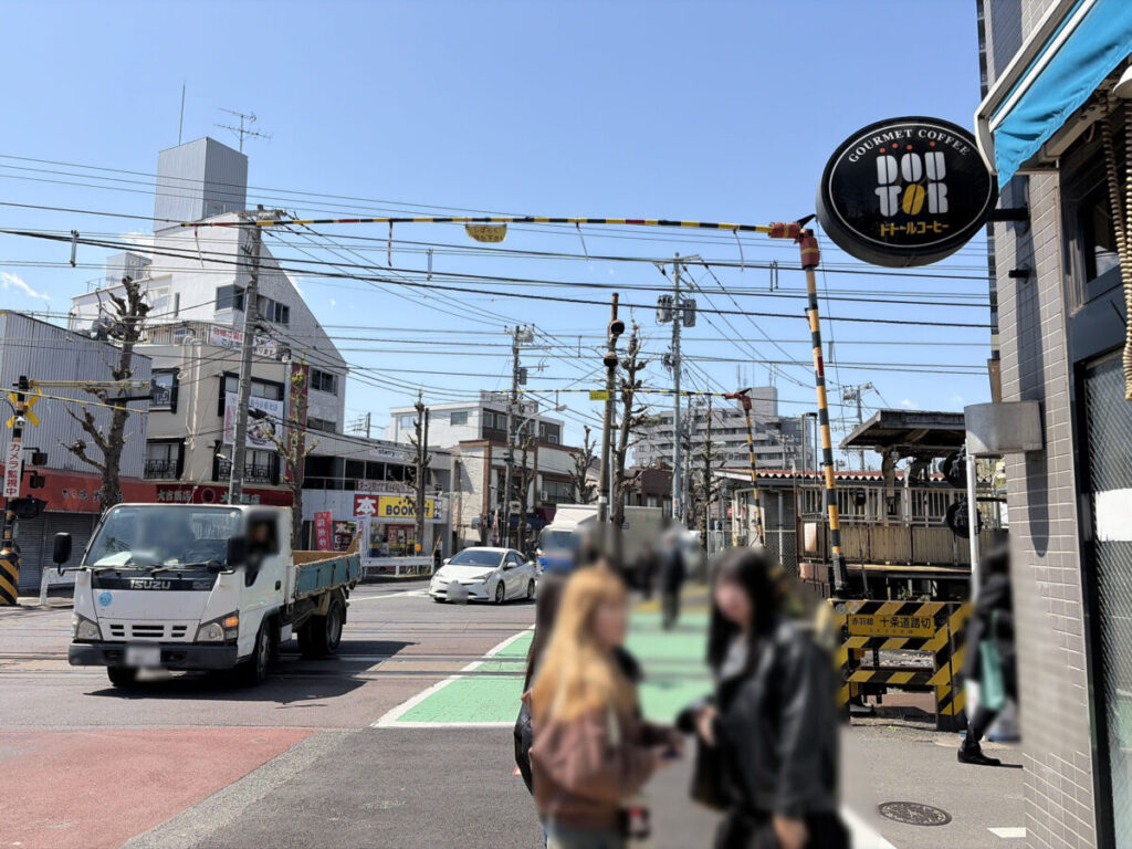 お店を背にして右はこんな感じ。すぐに十条駅南口改札があり、踏切を渡った先には「ジェイトモール」があります。