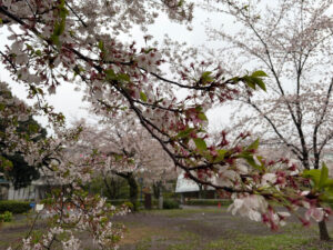 音無親水公園、雨に濡れた桜。 本日4月4日に開花状況をお届けします。 まだまだ咲いてますが。 地面をみると、ぼちぼち散ってます。 緑が目立ち始めたところも。 満開は...